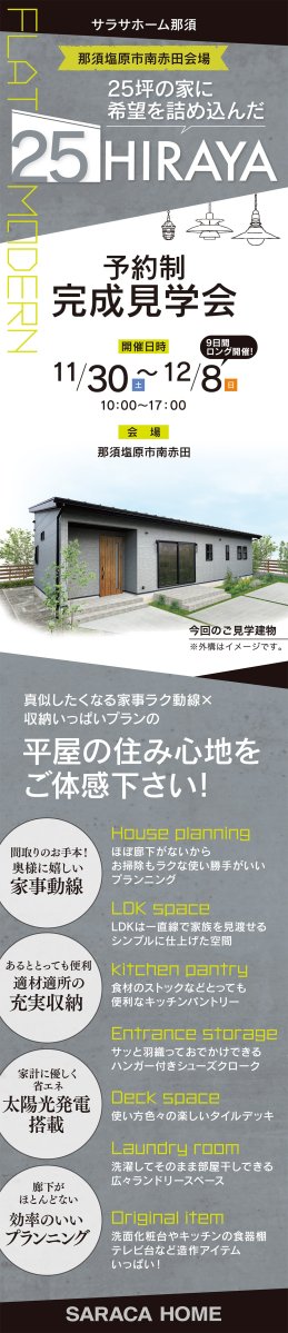 那須塩原市南赤田で、25坪の平屋の[予約制]完成見学会を開催致します。