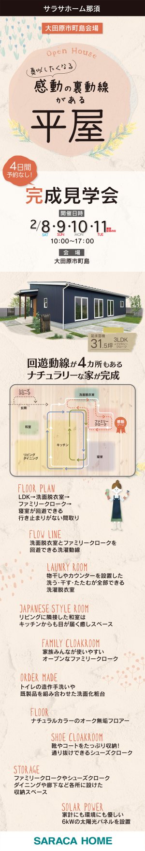 大田原市町島で、真似したくなる感動の裏動線がある平屋の完成見学会をフリーで開催致します。