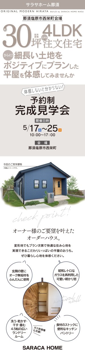 那須塩原市西栄町で、細長い土地をポジティブにプランした平屋の予約制完成見学会を開催致します。