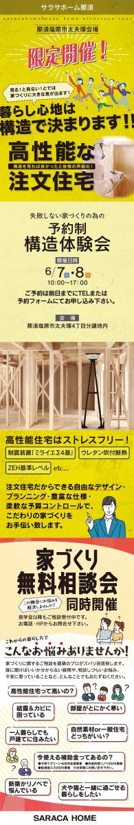 那須塩原市太夫塚で、失敗しない家づくりの為の予約制構造体験会を開催致します。