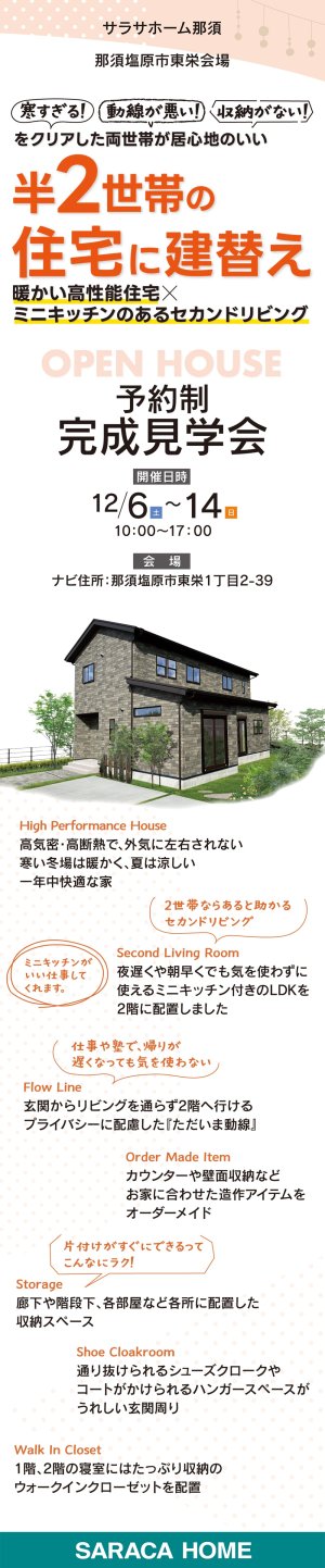 那須塩原市東栄で、寒すぎる!動線が悪い!収納がない!をクリアした両世帯が居心地のいい半2世帯の住宅に建替えた家の《予約制》完成見学会を開催致します。