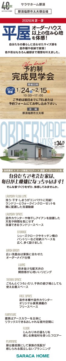 那須塩原市太夫塚で、オーダーハウス以上の住み心地を体感できる平屋の《予約制》完成見学会を開催致します。